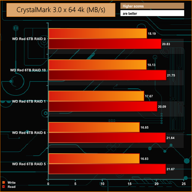 When dealing with the small bity files of everyday use, the DS918+ showed strong and consistent performance across the tested arrays. 4K random read performance averaged out at 21.19MB/s with the peak read performance coming when the drives were in a RAID 5 array at 21.67MB/s. Write performance averaged 17.53MB/s, peaking at 18.19MB/s while in RAID 0 mode.