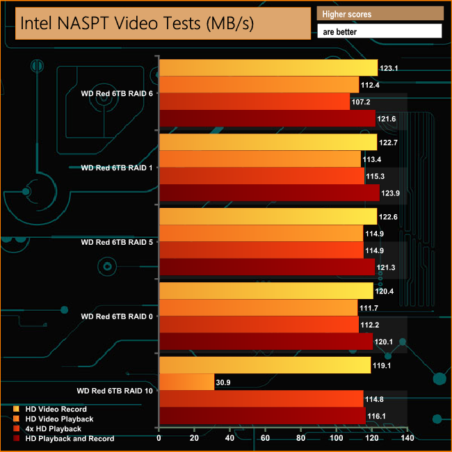 In the video tests of Intel's NASPT benchmark, the DS918+ showed strong performance breaking the 100MB/s mark for all tests with one notable exception. The fly in the ointment was the performance while in RAID 10 mode for the HD Video Playback test where the performance fell off a cliff at 30.9MB/s.