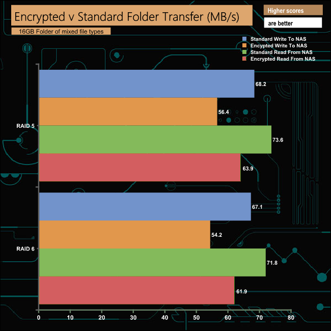 The AES-NI hardware encryption engine in the DS920+ does a very good job of negating the effects of dealing with data encrypted transfers. In a RAID 5 array there’s only just under 12MB/s drop in performance when writing to the DS920+ and just 10MB/s are dropped when reading the data back.