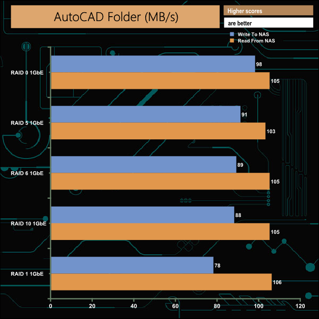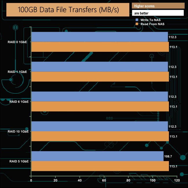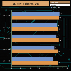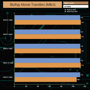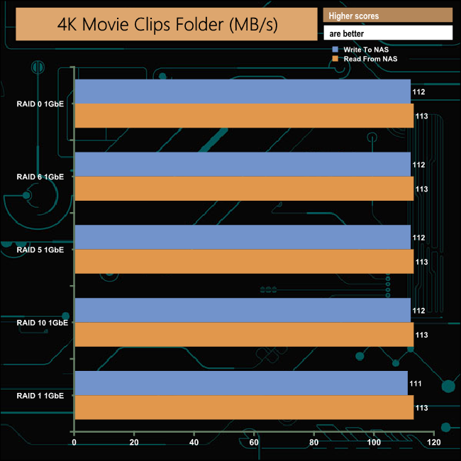 To test real-life file/folder performance we use a number of different file/folder combinations to test the read and write performance of the NAS device. Using the FastCopy utility to get an MB/s and time taken for each transfer, the data is written from and read back to a 240GB SSD.