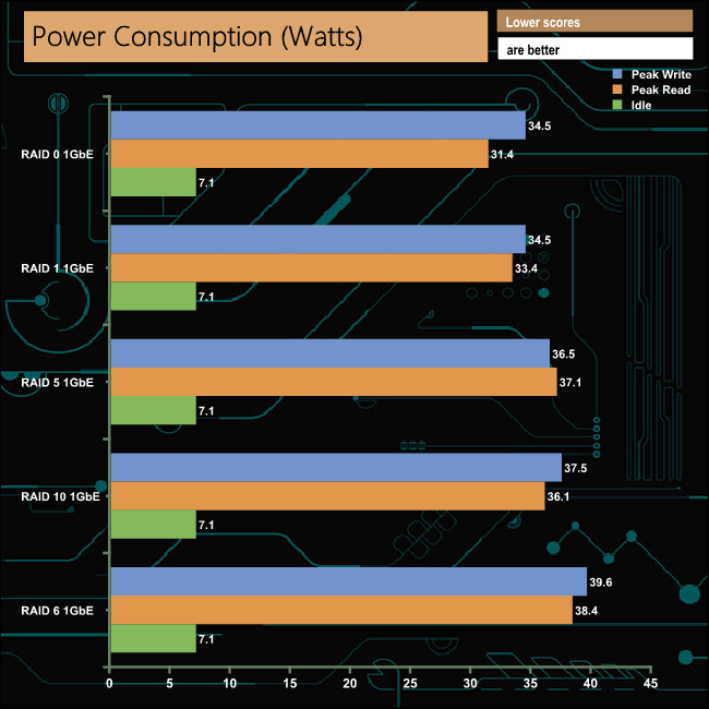 We tested the peak power consumption of a NAS at the wall during a run of CrystalDiskMark 5.0.2 as this version of the benchmark runs the read and write benchmark suites separately so it's easier to monitor what power the device is using during each function.