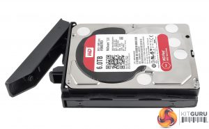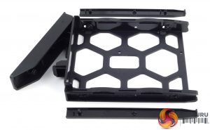 The plastic drive trays are tool-free for 3.5in drives but 2.5in drives will need fixing to the bays (enough screws are provided in the box). The larger drives are held in position by plastic strips which have pins on them to go through the holes in the sides of the trays and into the mounting holes of the drive, a simple but very effective tool-free design. The drive bay doors have physical security in the shape of simple locks (Synology bundle a pair of keys with the NAS).