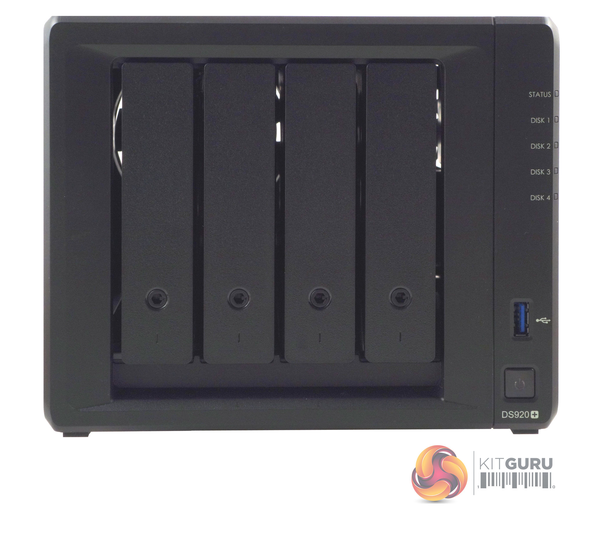 The Synology DiskStation DS920+ is a compact 4-bay tower design with vertically mounted drive bays. To the right of the drive bays sit the five vertically mounted indicator LEDs; the top one is for system status with the remaining four indicators for drive activity. Under these and towards the base of the unit sit a vertically mounted USB 3.0 port and the power button.