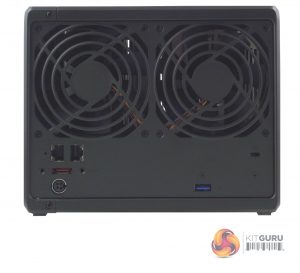 Dominating the rear panel are the grills for the 92mm cooling fans. Under the left-hand grill sit a pair of Gigabit Ethernet ports, a reset button, an eSATA port and the power in port. Under the right hand, fan sit a Kensington lock slot and a single USB3.0 port.