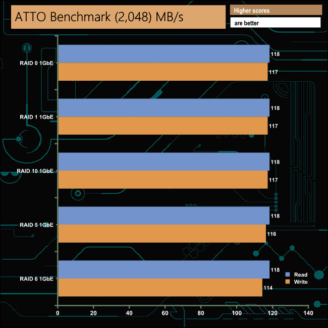Synology quote throughput figures for the DS920+ at up to 225.99MB/s for reads and 225.90MB/s for writes but this is with both Ethernet ports being used in Link Aggregation mode. With a single Gigabit connection, we got an average of 118MB/s for reads and 116MB/s for writes.