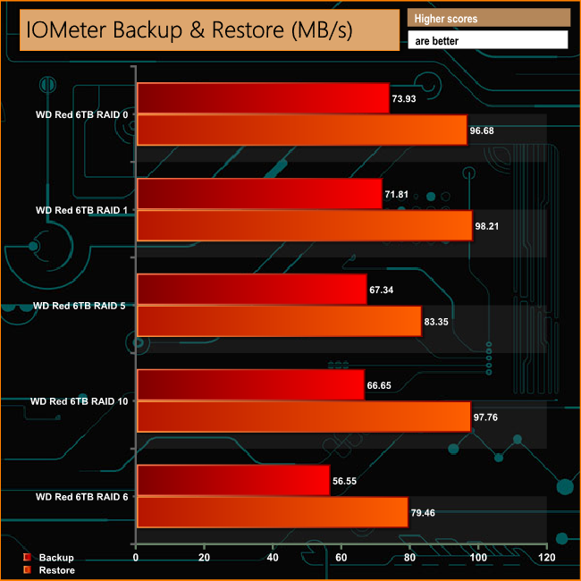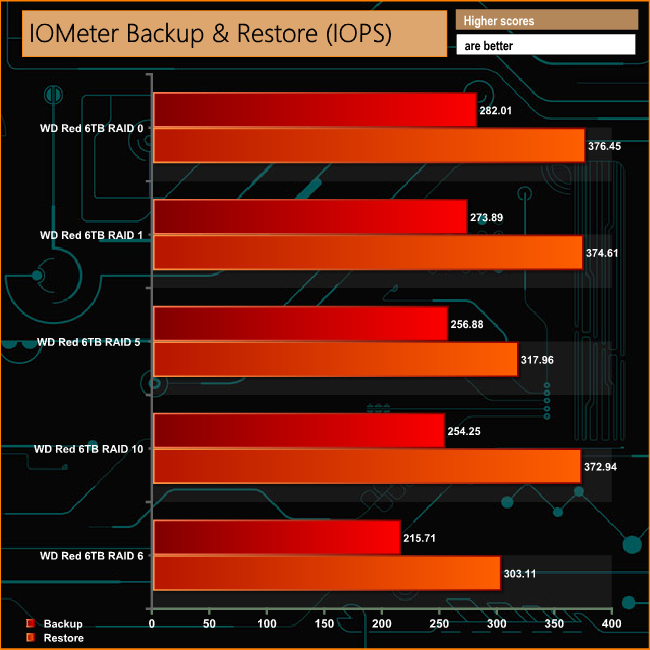 When dealing with the 100GB file in our backup/restore test the N4350's performance drops noticably when the drives are built in a RAID 6 array.