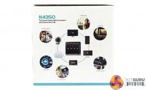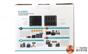 One side of the box has a list of some of the hardware inside the N4350 as well as a icon list of the box contents. The other side has yet more uses for the NAS; Media, File Download, Backup, Cloud and Surveillance Stations.