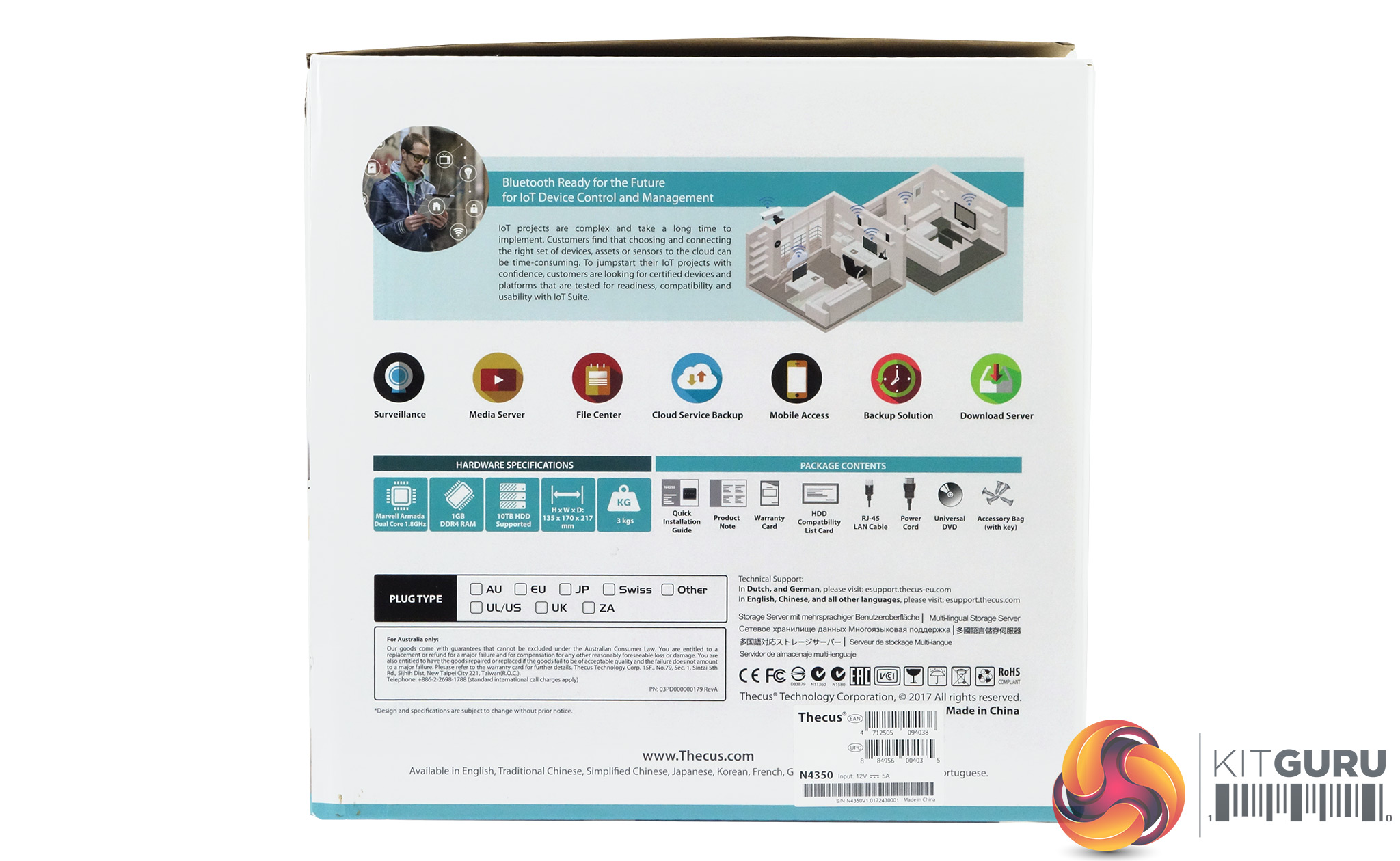 The rear of the box takes this idea further with images of the front and rear of the unit with details of various features. Under these two images are four illustrated examples of how the unit can be used; Surveillance management, combining with Plex to become a Home Media Center, using it with the Cloud and finally how it can be used for Data Protection.