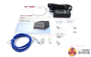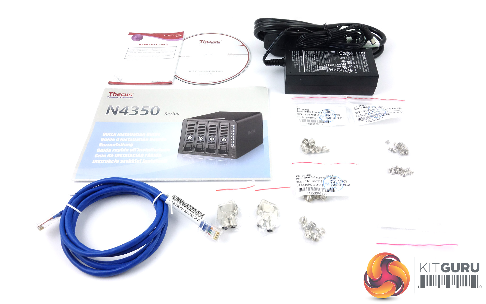 The box bundle supplied with the N4350 is pretty comprehensive with several bags of different sized screws (for 3.5 and 2.5in drives), two pairs of keys for the drive bay locks, a setup CD, quick start guide, LAN cable and finally a 60W (Hoioto ADS-65HI-12N-1) power adapter.
