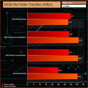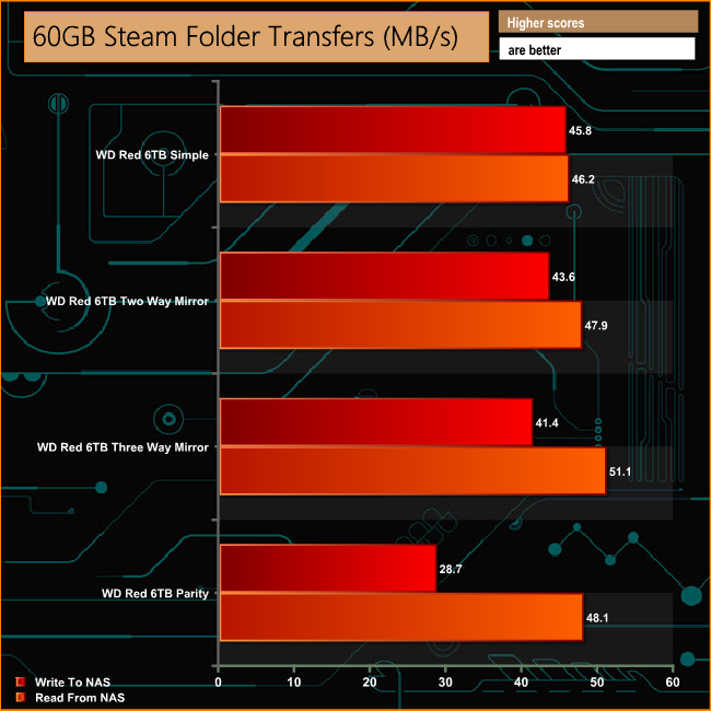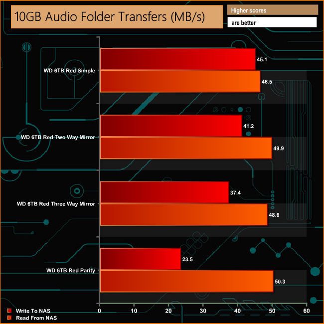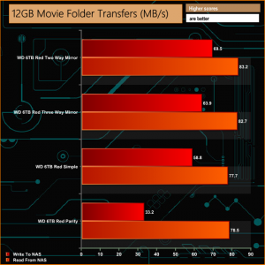 When dealing with our real life tests, the W5810 failed to break the 100MB/s mark in any of the media transfers. In all the tests, there is a good deal of consistency between the array types when writing the data back from the NAS. Once again the worst performance is when the disks are in Parity mode when the data is being written to them.
