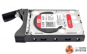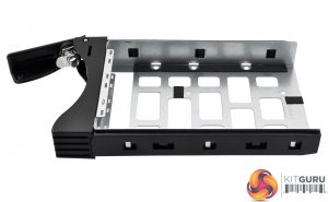 Like the NAS itself, the drive trays are constructed from metal with plastic tray doors which have activity/warning LEDs built in. The trays support both 3.5in and 2.5in drives with both sizes being secured from the underside of the trays with screws that are provided.