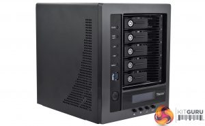 The W5810 is a very well built NAS and thanks to its metal chassis and cover it is no lightweight either – weighing in at a hefty 5Kg. The front bezel is made of good quality plastic. There is no drive bay cover door, giving easy access to the drive trays. With good physical security in mind Thecus has added decent locks to the drive trays. Sitting under the drives is a two line LCD display which shows system status and warning messages with four buttons to use to navigate through any options.