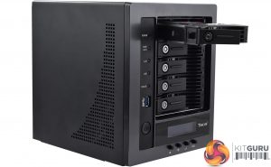 To the left of the drive bay are five vertically stacked indicator LEDs, one of the three USB 3.0 ports and the power button. For the indicator LEDs, Thecus has forsaken any fancy colours and gone with plain white although if there is a system error the system LED changes to red. From the top down the five indicators are; power, two LAN, USB activity and system status.