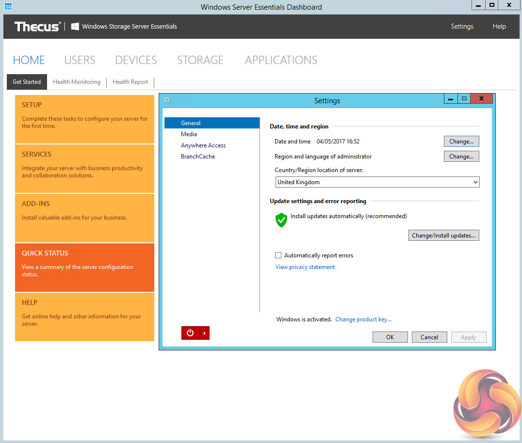 Clicking on the Getting Started tab reveals a block of five options; Setup, Services. Addins, Quick Status, and Help. Under Settings there are eight further submenus that allow setting up Windows Update, adding users and server folders, configure data backups and the Client Restore service which can connect other computers to the W5810. Microsoft's Anywhere Access is also offered in this section.