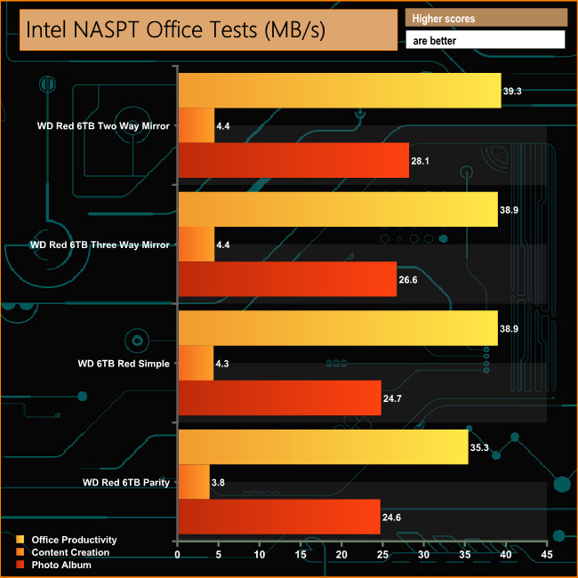 In the NASPT Office tests, the W5810 shows a good degree of consistency between the various disk setups, averaging 38MB/s for the Office Productivity tests and 26MB/s for the Photo Album tests. However, when it came to dealing with the mix of file types in the Content Creation test, the results were very disappointing.