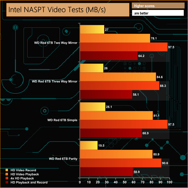 The W5810 doesn't break the 100MB/s mark for any of the NASPT video tests although it does it very close in a couple of the 4x HD Playback tests. While the results from the HD Video Playback, 4x HD Playback and HD Playback and Record are reasonable enough, the HD Video Record results are disappointing.