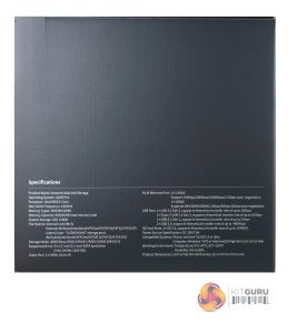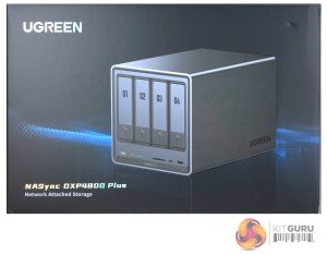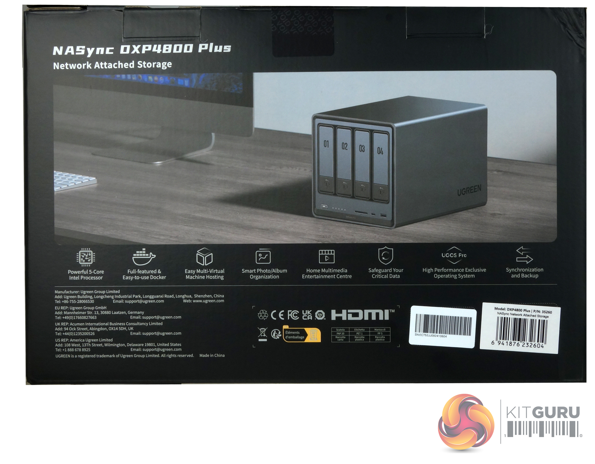 The NASync DXP4800 Plus comes in a compact box. The front of the box has a large image of the NAS on it. The rear of the box has another smaller image of the unit under which there is a row of icons displaying some of its features; 5-core Intel Processor, Fully featured Docker, Virtual Machine Hosting, Smart Photo, Home Entertainment centre, Data safeguard, exclusive operating system and Synchronization and backup.