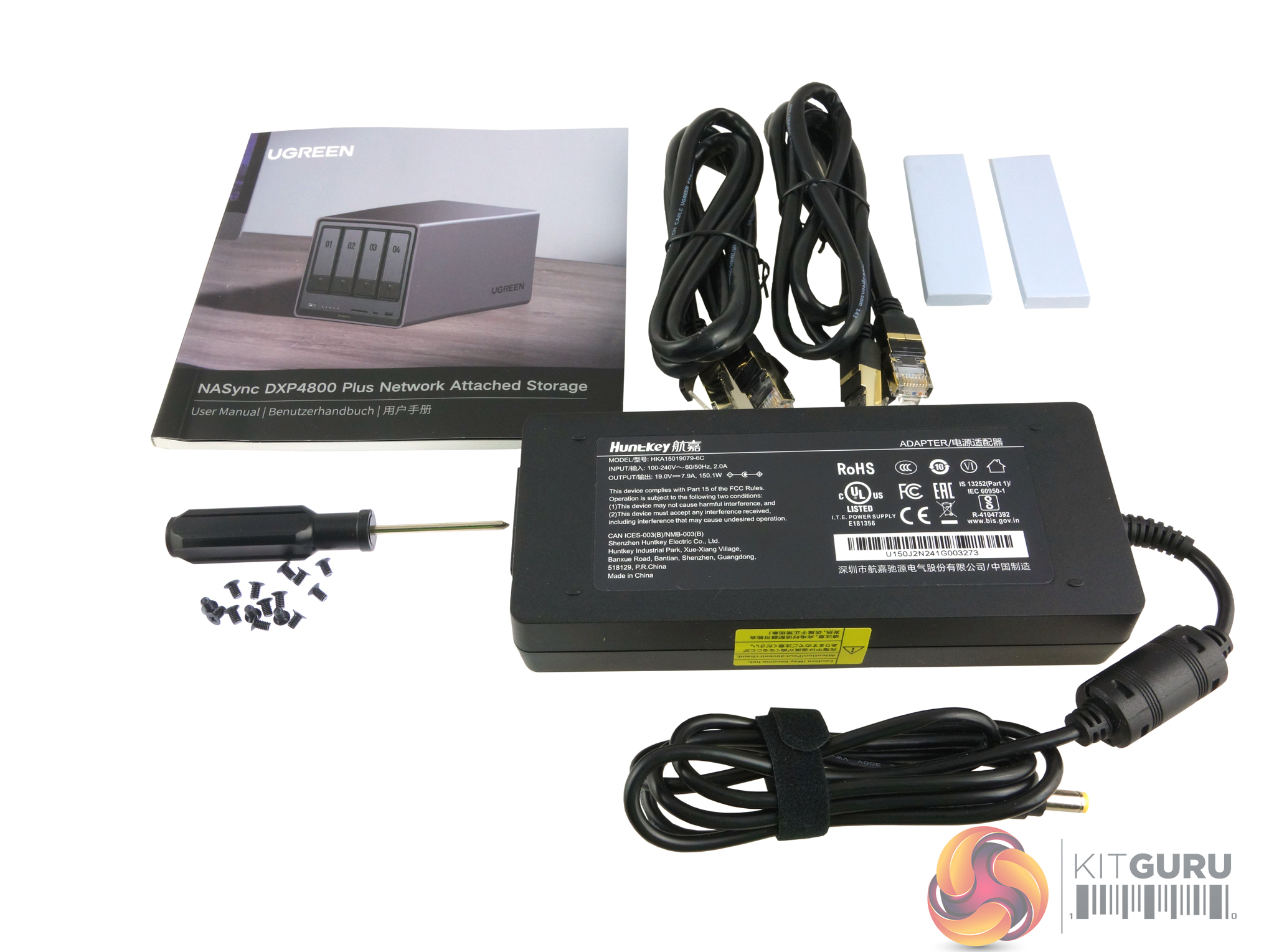 A quick shout-out to Ugreen on the quality of the box and how the DXP4800 Plus is packed, and protected by foam inserts. Even the box with all the accessories is classier than the normal box with clear labelling as to what's in it. Bundled with the DXP4800 Plus are all the bits and bobs you need to get started; a pair of Cat7 ethernet cables, a power adapter (HuntKey, HKA15019076-6C, 150.1 W, 19.0 V), screws (for 2.5in drives), small screwdriver, two thermal pads ( for any M.2 SSDs you may want to install), a pair of keys to secure the drive bay doors and a very good manual.