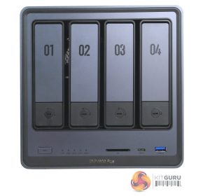 The Ugreen NASync DXP4800 Plus is a compact 4-bay NAS using a metallic grey plastic external enclosure over an aluminium alloy internal frame. The system LEDs are all in a line at the bottom of the front panel next to the power button. There are five of them, one for the LAN connectivity and the rest for disk activity. Next up is an SD 3.0 Card slot and then two USB 3.2 Gen 2 (10 Gbps) ports, one Type-C and the other Type-A.