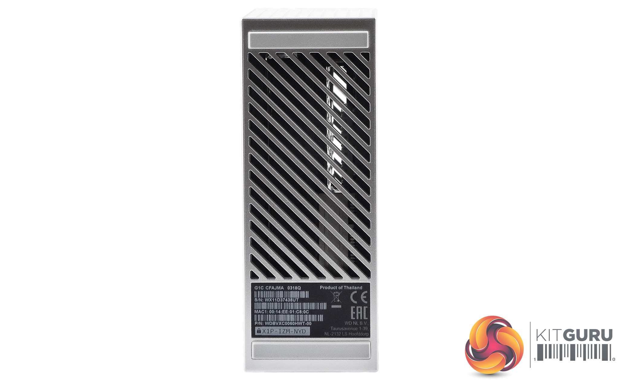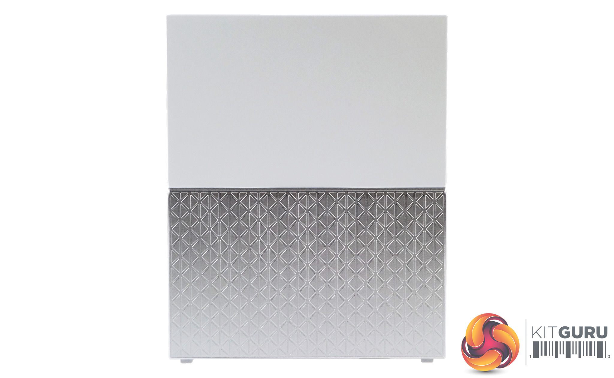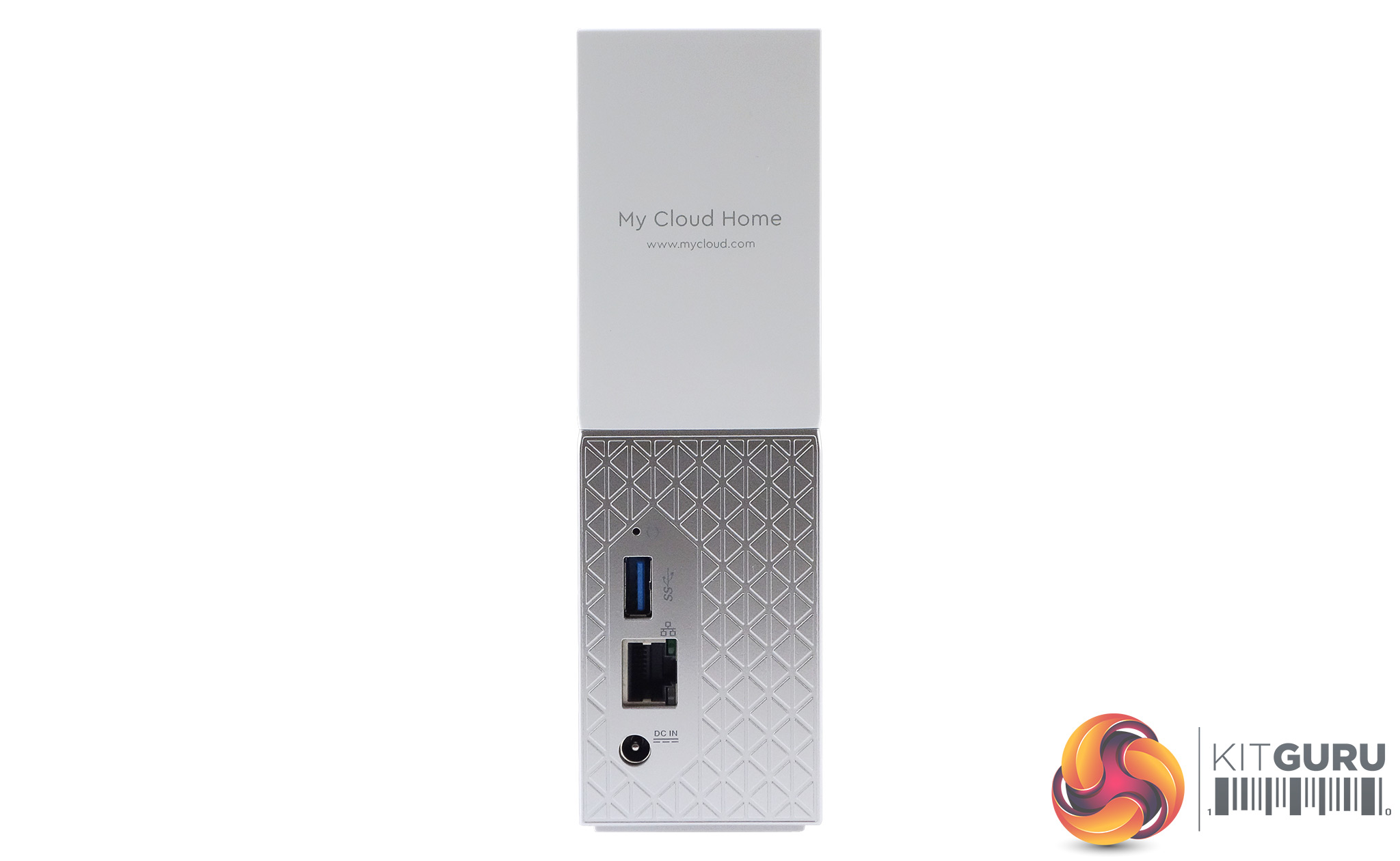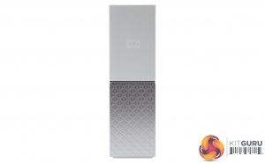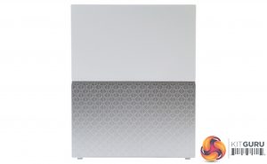 The My Cloud Home features a new design, moving away from the rounded, single colour units to a dual colour with a sharper cornered look and feel. The top half of the unit has a plain white finish while the bottom half is a patterned silver.