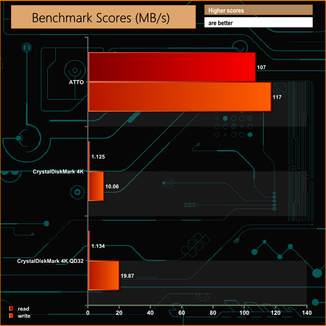 In the ATTO benchmark we got slightly better Sequential write performance at 117MB/s than reads at 107MB/s. Similarly in the Crystal Disk Mark tests, the write performance outshone reads.