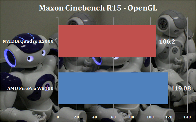 Results in the latest version of Maxon Cinebench parallel those from the previous version, with the Armari's ten 3GHz cores paying huge dividends for rendering, giving it twice the performance of the YOYOTech M-Cube WS2. As before, the AMD FirePro W8100 is ahead of the NVIDIA Quadro K5000, although it's not a complete annihilation.