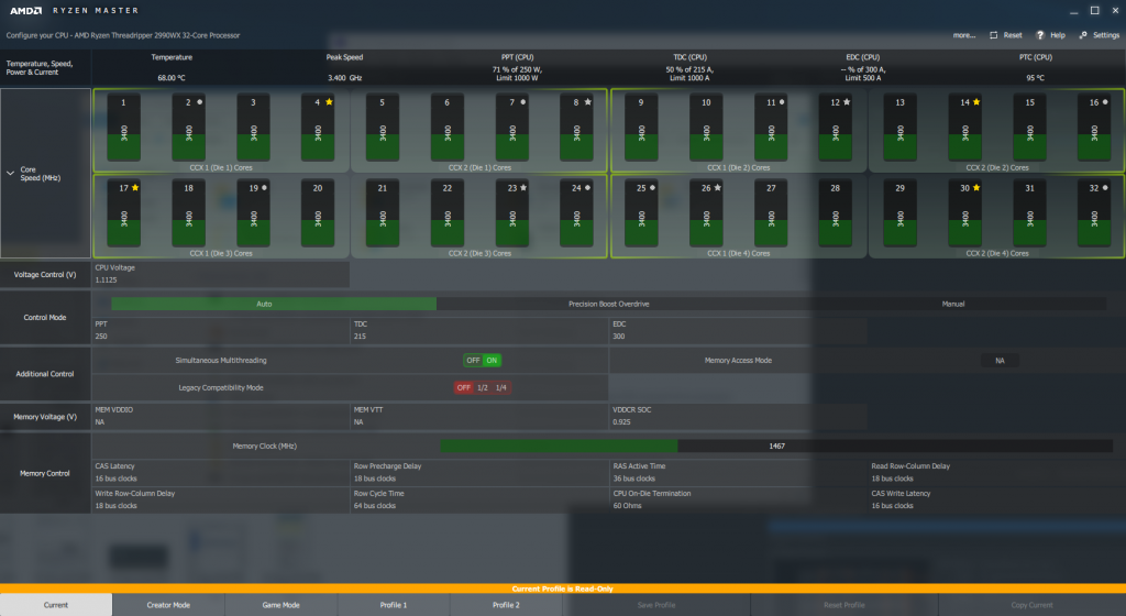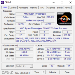 The 2990WX is nominally a 3GHz processor with a top 4.2GHz single-core Turbo mode, and two virtual cores per physical one so you have 64 (count 'em) threads for multithreaded activities like 3D rendering. However, as we discovered when we first reviewed this processor, the clock speeds and core count are really just the baseline of the picture.