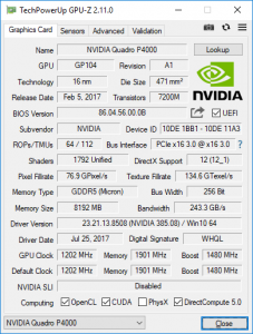 The P4000's 8GB of GDDR5 memory runs at 1,901MHz on a 256-bit bus, providing a decent 243GB/sec of bandwidth, although the higher-end P5000 and P6000 go well beyond this thanks to their use of the faster GDDR5X memory. On the positive side, the P4000's power consumption is just 105W, the card takes up a single slot, and only requires a single 6-pin power connector. So you're getting a lot of GPU performance for a relatively miserly electrical consumption.
