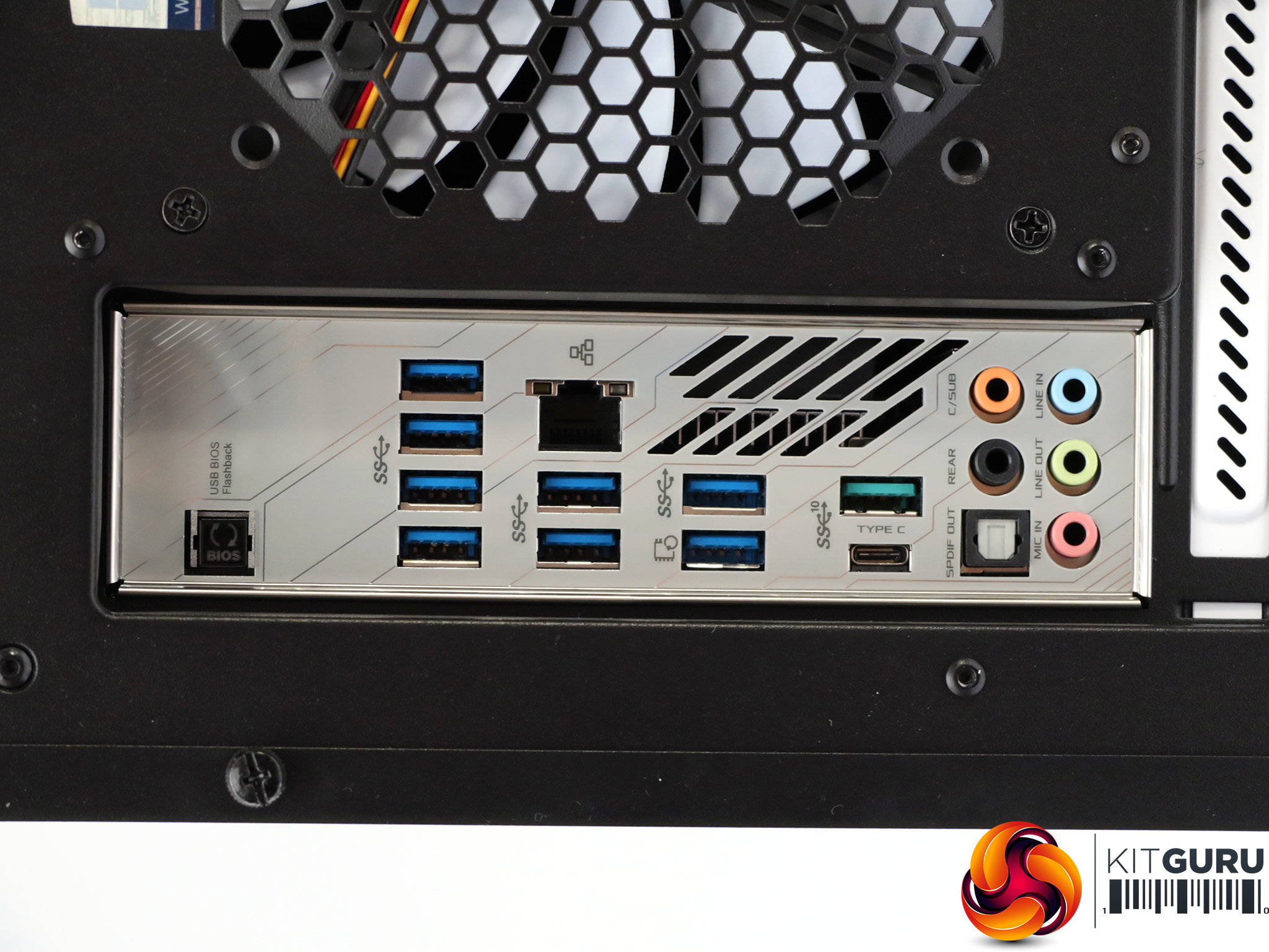 The rear of the chassis is bristling with connectivity. At the very top is a button for flashing back the BIOS via USB if it gets corrupted. Further down are four USB 3.1 Gen 1 ports, Gigabit Ethernet LAN with two more USB 3.1 Gen 1 connections, and then another two USB 3.1 Gen 1 ports on their own. Further along are two USB 3.1 Gen 2 connections, one of which is Type A and the other Type C. Finally, there is the usual quintet of analog audio minijacks plus optical S/PDIF.