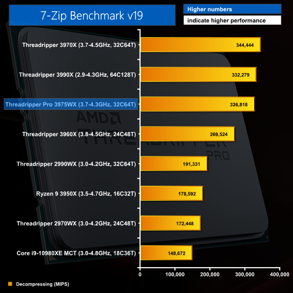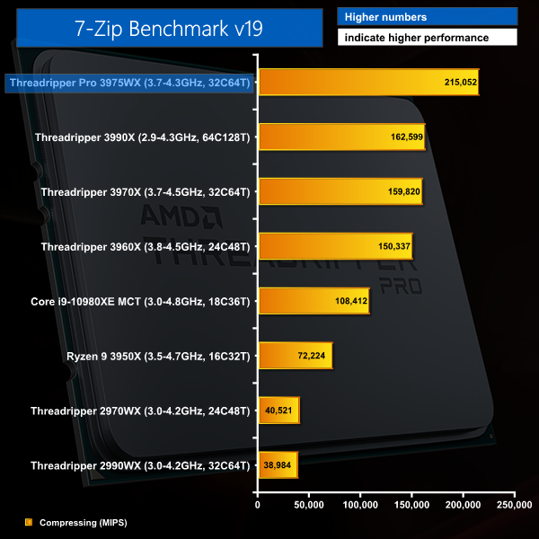 7-Zip Decompressing shows similar results to the other CPU tests however 7-Zip Compressing is a completely different story as it relies on memory bandwidth to deliver stellar results. This takes us to the heart of Threadripper Pro where it misses slightly in test after test but when it hits, it wins massively.