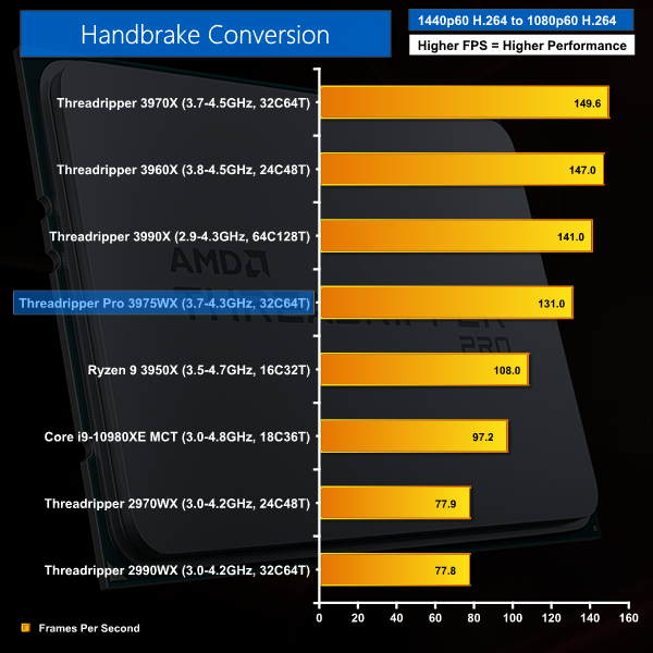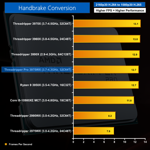 In Handbrake we see similar results to Blender and Cinebench with Threadripper Pro again losing out to its speedier relations.