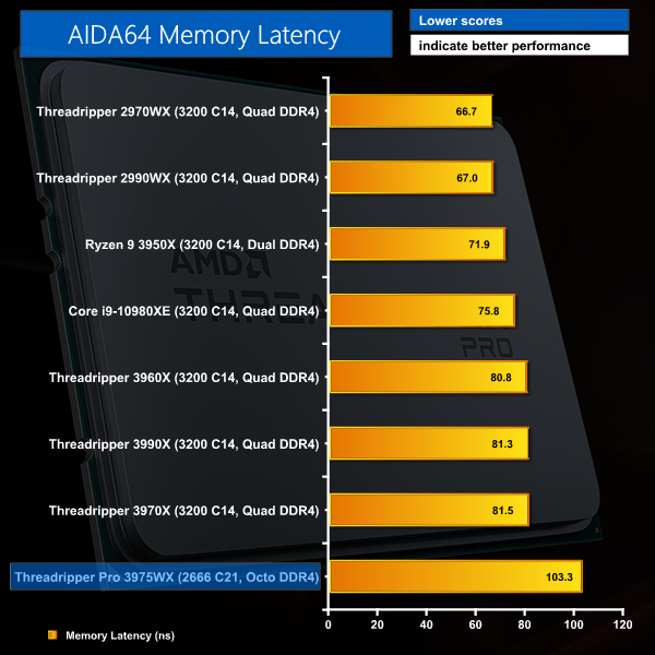 AIDA64 demonstrates the point perfectly. Threadripper Pro has eight channels of DDR4 bandwidth to work with, and has the potential to deliver monumental performance in appropriate workloads. Unfortunately our test system was delivered with DDR4-2666MHz running at CL21.
