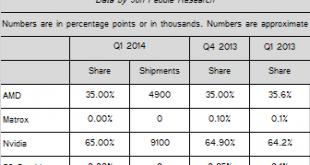 Since shipments of personal computers in the first quarter of the year dropped again both sequentially and annually, it is not surprising that sales of graphics adapters (both discrete and integrated) also contracted in the Q1 2014. Advanced Micro Devices suffered most from the declines and its overall share of …