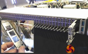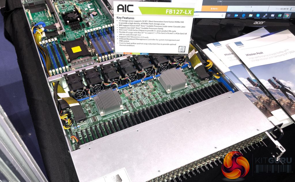 The AIC FB127-LX Storage Server offers 36 NF1 SSD bays – each of which could be populated with a 16TB NVMe Solid State Drive – for a total of 576 TB of storage. Just picturing 576x 1TB mechanical drives – and imaging that capacity in a space that’s less than 45mm high, gives you pause for thought. And a desire to own. David Huang, VP of Sales for Taiwanese OEM manufacturer AIC, explained the amazing storage densities that these new platforms can offer. The NF1 SSDs are roughly the same size as an M.2 but capacities range up to 16TB per drive.