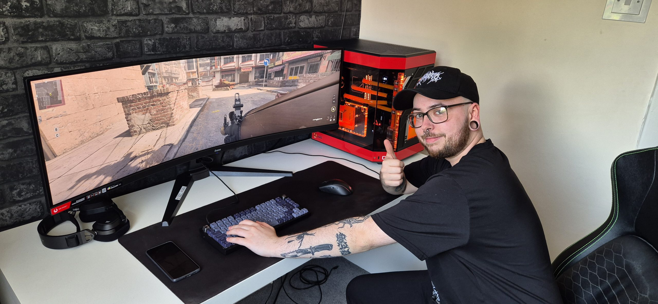 Here is how the whole setup is looking, now all placed in its new home. Lewis, the winner of the competition, can be seen enthusiastically launching Call of Duty in full 32:9 glory: