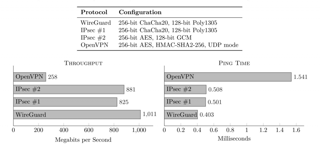 Above is a graph showing the difference in speed – in throughput and ping – between OpenVPN and the newer WireGuard. As shown, WireGuard's data shows it is able to put send and receive more data in lesser time. OpenVPN is one of the most popular protocols at the moment and has the benefit of running on almost any device and operating system.