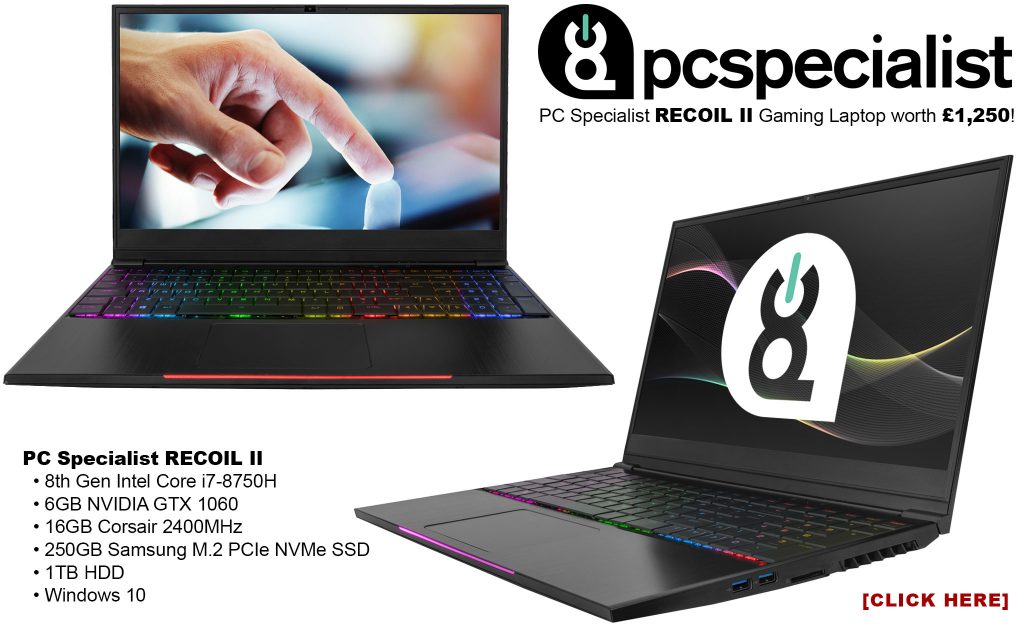 To enter, just click here or on the image of the PC Specialist RECOIL II gaming laptop (full details on this amazing prize here).