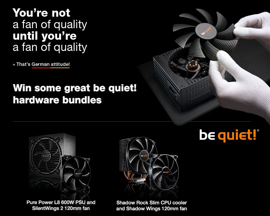Being the nice people that we are here at KitGuru, we thought we'd let you know about a little competition going on over at YOYOTech right now. YOYOTech has teamed up with beQuiet! to give away a Pure Power L8 600W PSU with a Silent Wings 2 120mm fan, with the second prize being a Shadow Rock Slim cooler, coupled with an extra Shadow Wings 120mm fan.