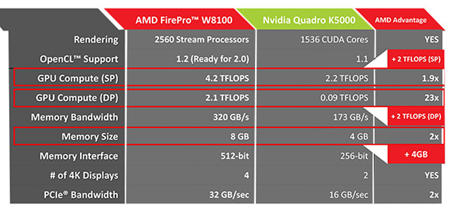 This simple comparison chart has been drawn up by AMD workstation marketing gurus like Glen Matthews, with the specific aim of making the W8100 look good against the nVidia K5000. Wonder if nVidia has a set of slides of their own?