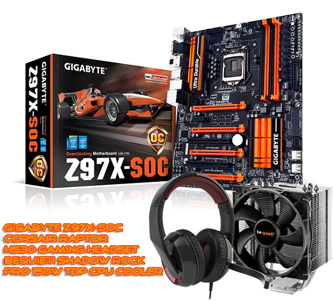 The 1st Prize is a Gigabyte Z97X-SOC Motherboard, Corsair Raptor HS30 Gaming Headset and bequiet! Shadow Rock Pro 150W TDP CPU Cooler. Gigabyte are also offering two runner up prizes as well!