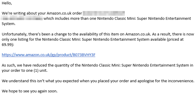 Amazon contacted its UK customers this morning to break the bad news that it had retroactively limited its SNES Mini orders to just one console per customer. This only affects those who ordered multiple consoles, with singular purchases remaining the same.