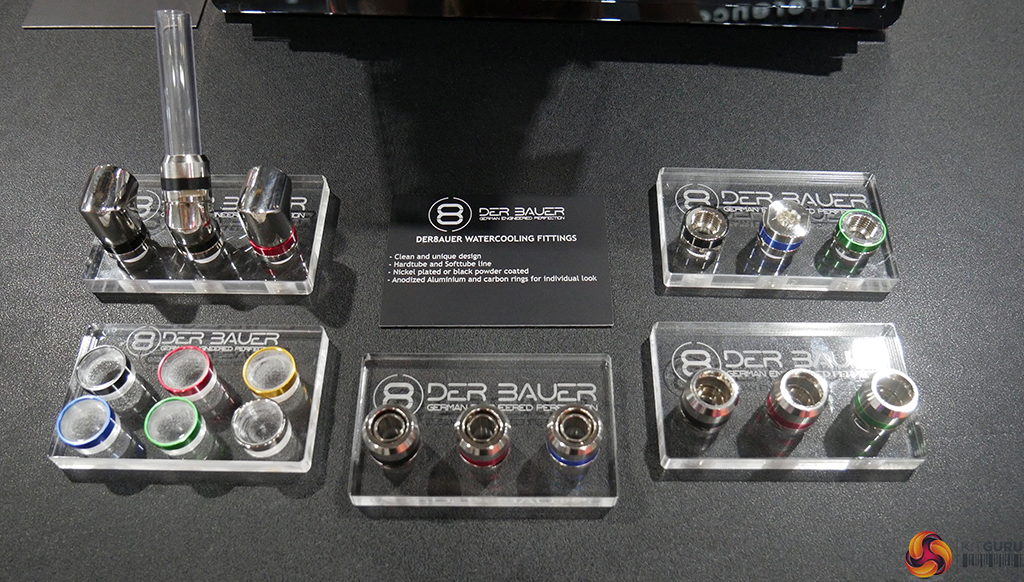 We also saw a range of new fittings from der8auer, for both soft and hardline tubing. These are pretty cool in that they have anodised aluminium ‘accent rings', which work modularly – so you can add extra colours or accents to your fittings on a per-fitting basis, depending if you want that bit of extra pizzazz in your build.