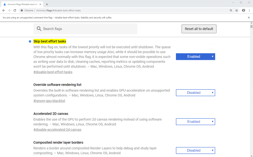 As Ghacks notes, the feature is called “skip best effort tasks” and is designed to overlook low priority actions while Chrome is in use. Of course, these tasks still need to be executed, but they’re put the back of the queue and made to wait until shutdown. Telemetry, writing user data to disk and disk cache cleaning are among the listed low priority tasks.