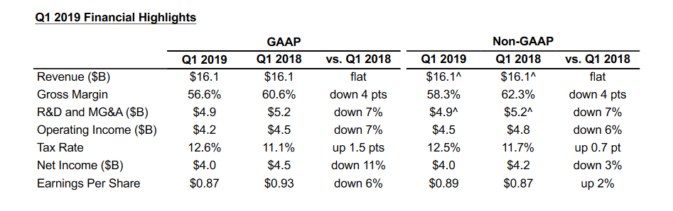 Bob Swan’s first quarterly earnings report since stepping up as Intel’s permanent CEO managed to outdo analyst predictions of $16.02 billion in Q1, instead bringing home $16.06 billion. This number is flat in comparison to 2018’s first quarter, but saw a drop in operating income from $4.5bn to $4.2bn, net income fall from $4.5bn to $4.0bn and gross margins decline 4% year-on-year.
