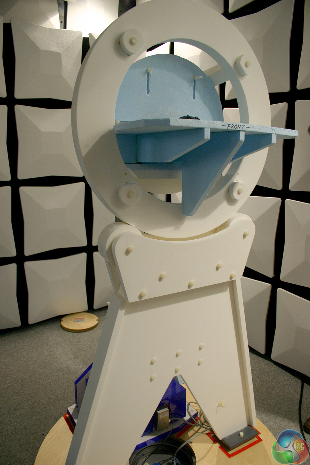 But what happens in there? Well, that contraption above has a mouse strapped to it (you can see it poking just above the blue shelf). It then rotates 360 degrees one way and 360 degrees the other, with Logitech using that giant contraption that looks like a Dr Evil “laser,” to record the strength of its wireless signal from every angle. The anechoic chamber makes sure that no outside interference messes with the reading.