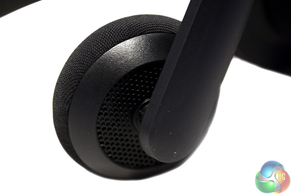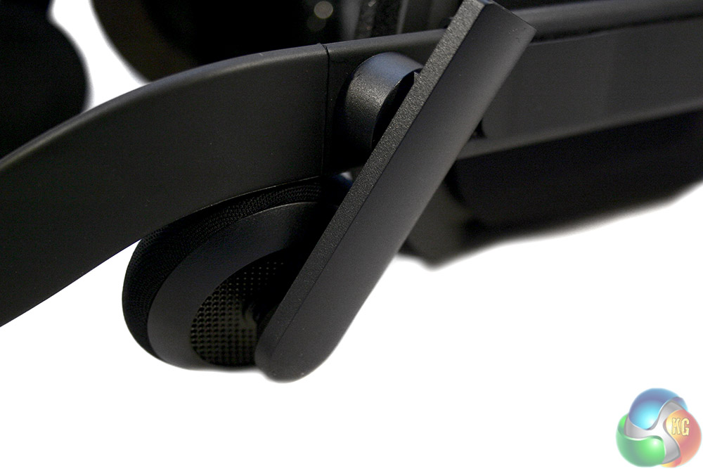 Moving around to the side of the headset, we can have a look at one of its major selling points – the built-in headphones. These operate on a slightly sprung, swivel head, letting you rotate them through about 60 degrees, as well as pry them from your ears easily.