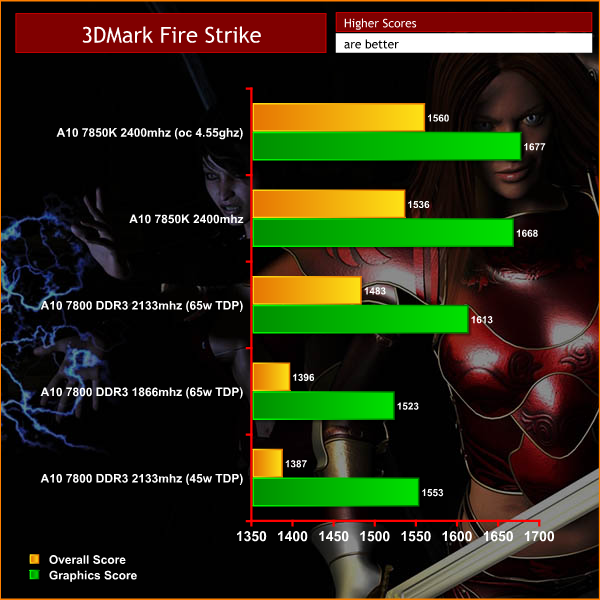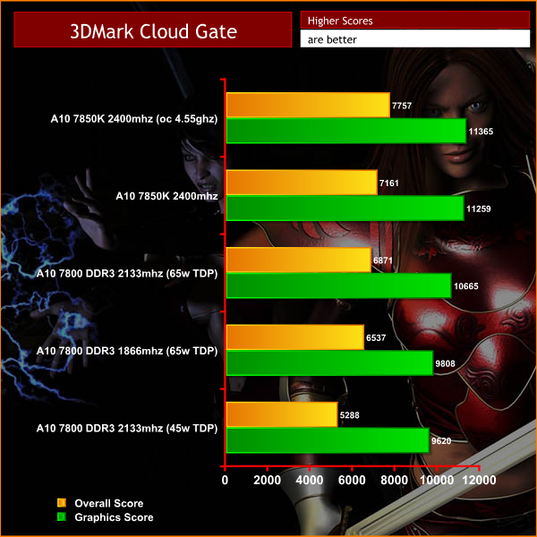 The Cloud Gate benchmark test in 3D Mark sets the scene very nicely. Increasing the speed of the DDR3 memory with A10-7800 brings a useful increase in the the test score from 6,537 to 6,871 and then switching to the A10-7850K and overclocking the APU further increases the test score to 7,161 and then 7,757.