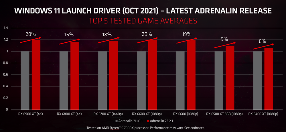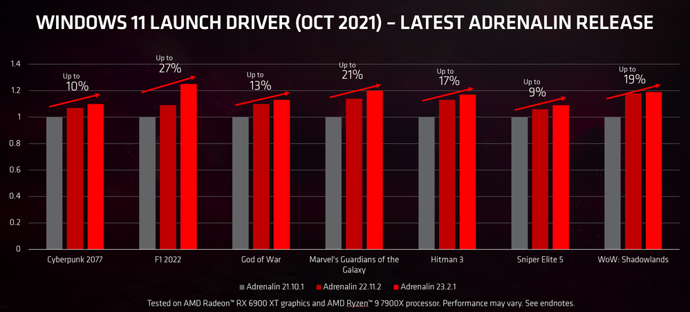Yesterday, AMD began rolling out AMD Software Adrenalin Edition 23.2.1, bringing performance improvements and optimisations for RX 6000 graphics cards in particular. The new update adds support for RX 6000 GPUs in Dead Space Remake and Forspoken. The new driver also improves performance in a number of popular titles, with gains of 10% in Cyberpunk 2077, a 20% improvement versus launch drivers in World of Warcraft, a 27% improvement in F1 2022 and more. You can see the breakdown in the slides below: