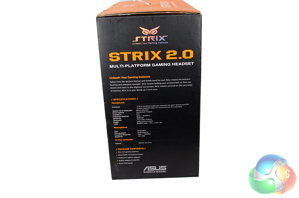 The Asus STRIX 2.0 is a pretty large headset, as you can tell by the size of the box. The front lists some of the more prominent features of the headset, while the back gets a little more in-depth.