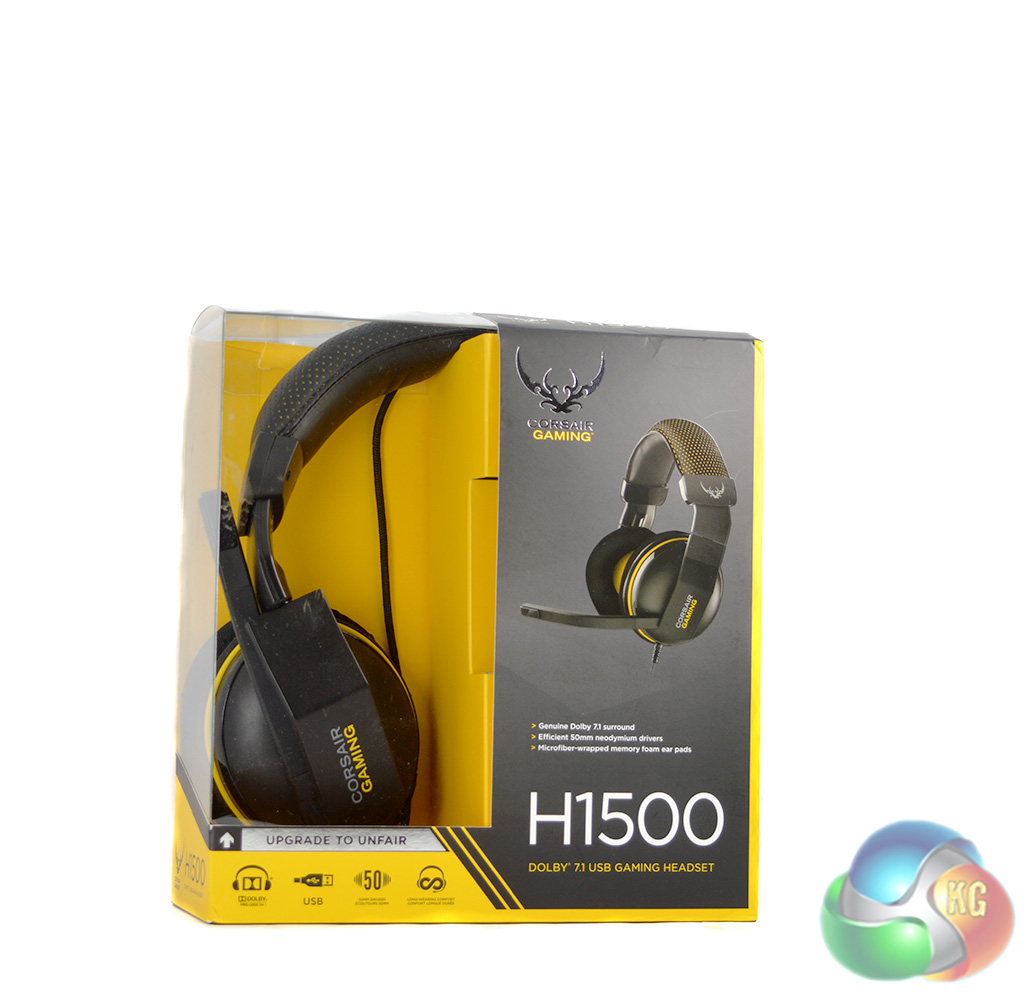 The front of the Corsair Gaming H1500 headset box lists several key features including Dolby 7.1 virtual surround sound, 50mm neodymium drivers and memory foam ear pads for comfort.